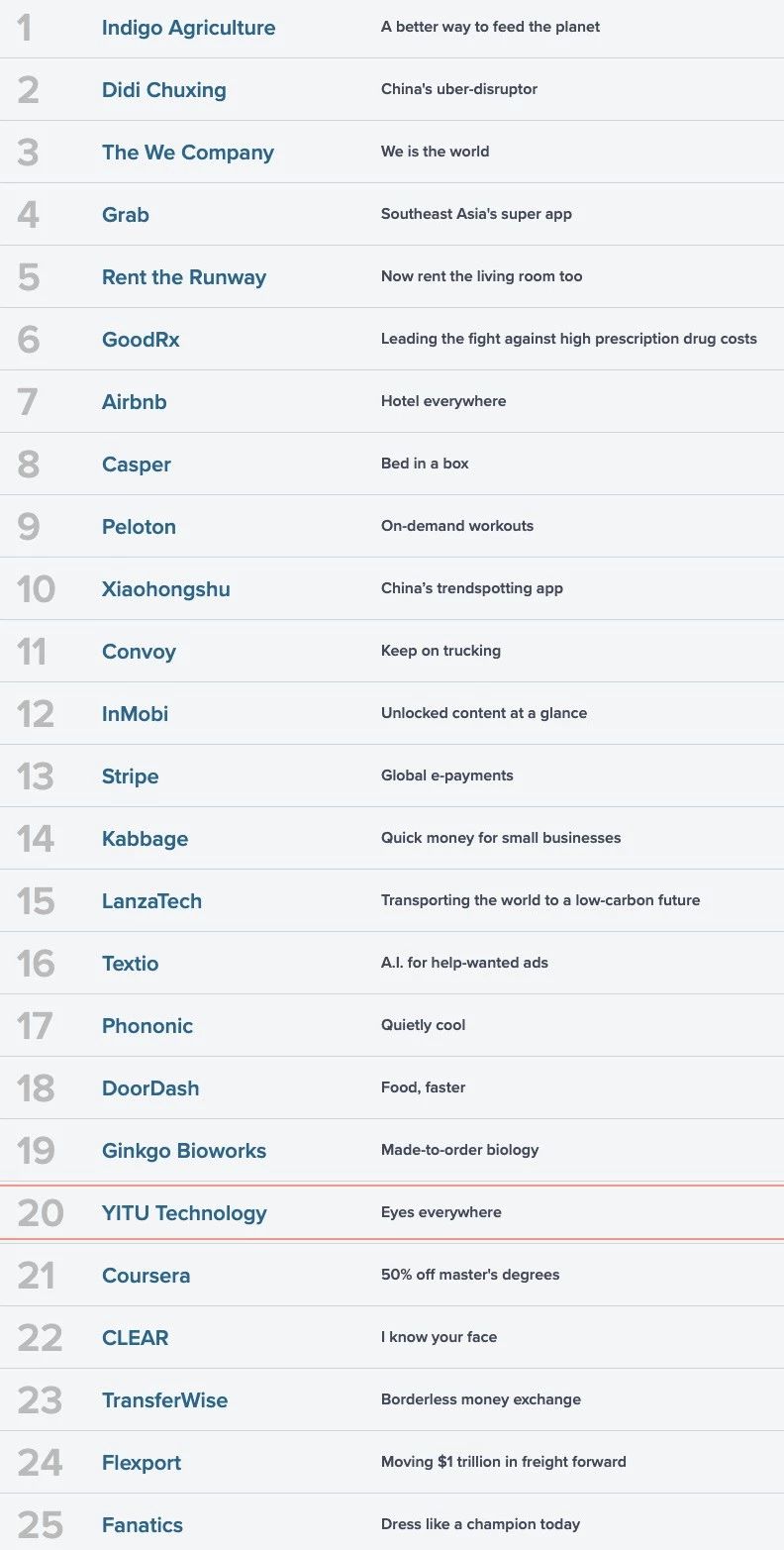 5月15日,全球最有影响力的财经媒体之一、美国全国广播公司财经频道(CNBC)公布了其2019年度“颠覆企业”50强榜单(2019 CNBC Disruptor 50),依图作为唯一一家中国AI公司上榜,其它2家中国公司分别是滴滴出行、小红书。