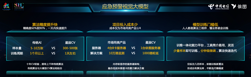 视频监测预警在实际应急应用中面临多源海量应急视频数据检索难度大;训练样本难获取;识别能力单一,定制周期长,成本高等诸多难点,此次由中国电信与依图科技联合打造的应急预警视觉大模型,充分发挥双方优势能力,体现出强大的实战应用能力:
