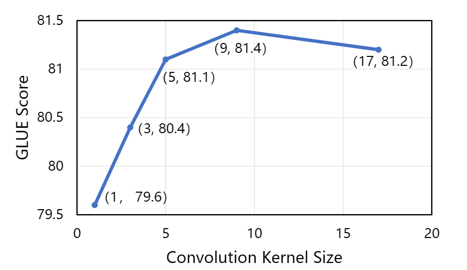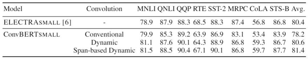 可以看出在模型大小一致的情况下,传统卷积的效果明显弱于动态卷积。并且,本文提出的基于跨度的动态卷积也比普通的动态卷积拥有更好的性能。