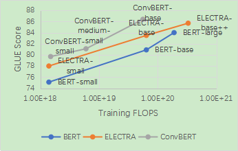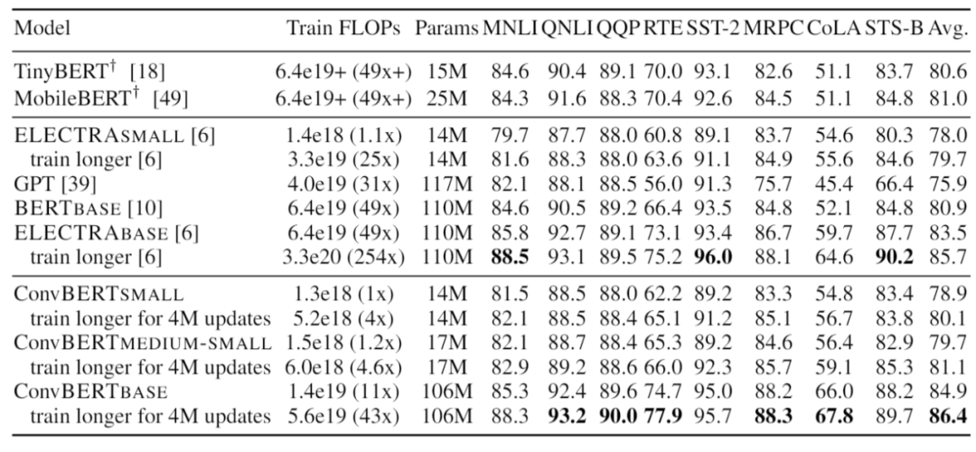 这一模型在节省了训练时间和参数的情况下,在衡量模型语言理解能力的 GLUE benchmark 上相较于之前的 State-of-the-art 方法,如 BERT 和 ELECTRA,都取得了显著的性能提升。其中 ConvBERT-base 模型利用比 ELECTRA-base 1/4 的训练时间达到了 0.7 个点的平均 GLUE score 的提升。