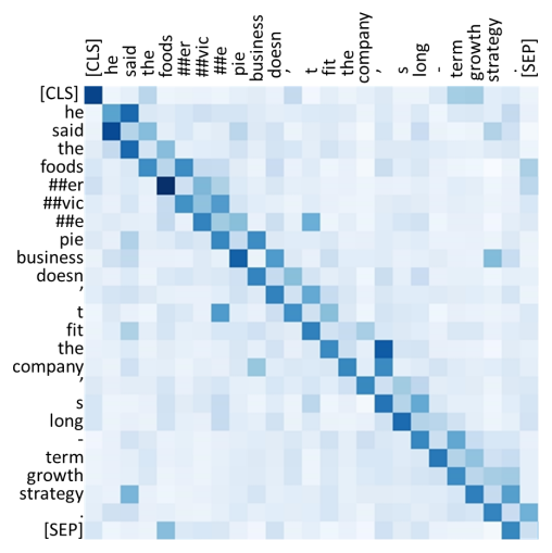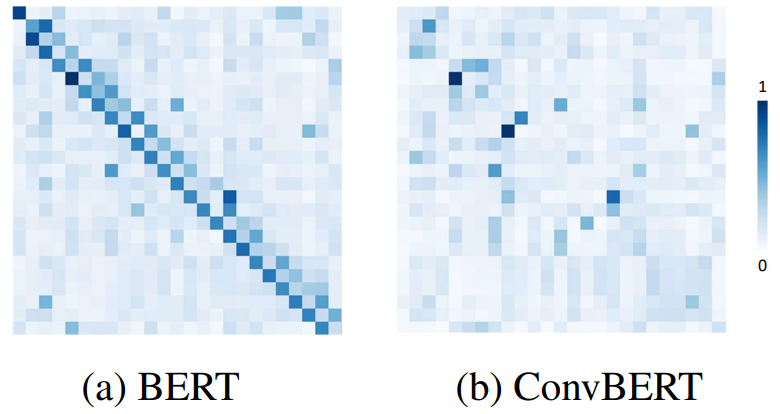 从下图 BERT 和 ConvBERT 中的自注意力模块的 attention map 可视化图对比也可以看出,不同于原始的集中在对角线上的 attention map,ConvBERT 的 attention map 不再过多关注局部的关系,而这也正是卷积模块减少冗余的作用体现。