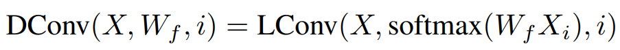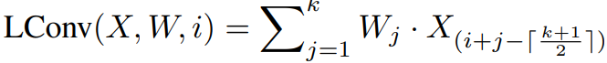 其中X∈R^n×d 为输入的特征,而W∈R^k 则是卷积核,k 为卷积核的大小。轻量卷积的作用是将输入的每个词对应的特征附近的 k 个特征加权平均生成输出。在此基础上,之前提到的动态卷积可以写作