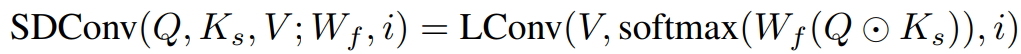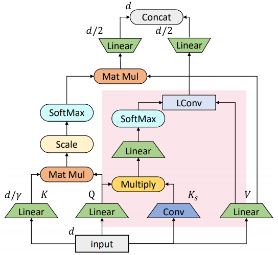 此处,输入 X 先经过线性变换生成Q和V,同时经过卷积生成基于跨度的K_s,由Q⊙K_s经过线性变换以及 softmax 来产生卷积核与V进一步做轻量卷积,从而得到最终的输出。