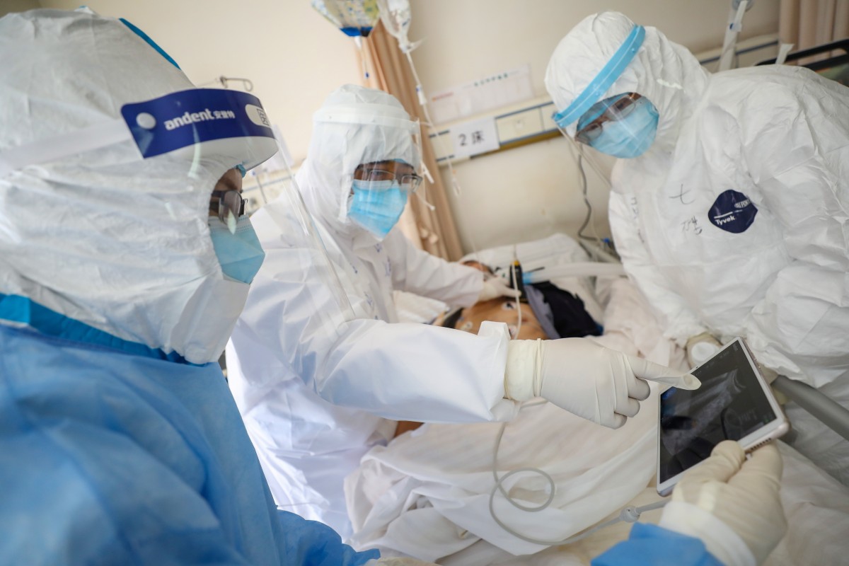 Medical workers in protective suits attend to a patient inside an isolated ward of Wuhan Red Cross Hospital. Photo: Reuters