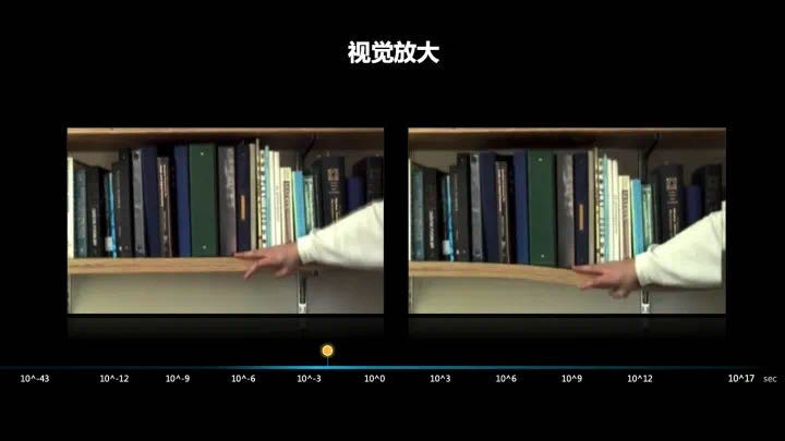 Let's look at the changes in the physical world on a one-second scale. The photo on the left is a normal shot of a hand holding a bookshelf, and the photo on the right is a machine seeing the different frequency signals in the video, capturing the tiny vibrations, magnifying them by 100 times, 1000 times, and you can see how the wood is subjected to force, which is very subtle on the time axis.